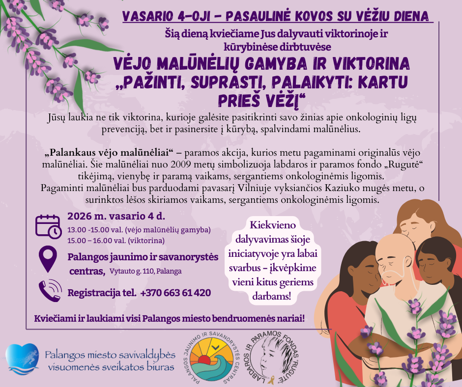 Vasario 4-oji – Pasaulinė kovos su vėžiu diena. Minint šią dieną kartu su Palangos jaunimo ir savanorystės centru kviečiame į viktoriną ir kūrybines …