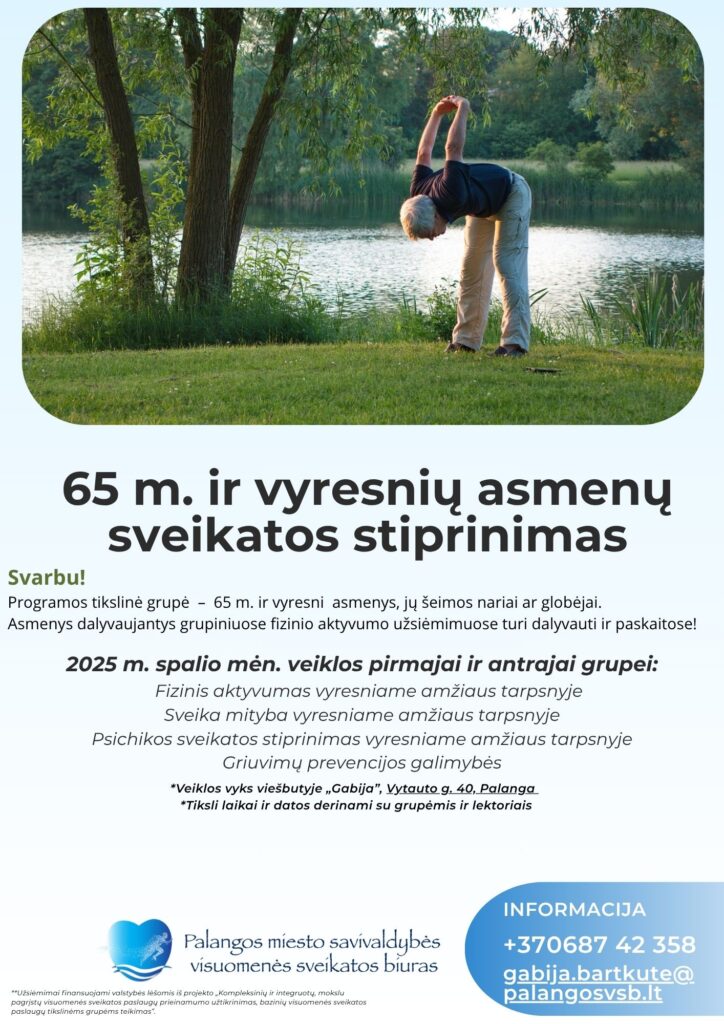 65 m. ir vyresnių asmenų bei jų šeimos narių ar globėjų programa, skirta motyvuoti 65 m. ir vyresnius gyventojus gyventi sveikiau, stabilizuoti vyresnio amžiaus Lietuvos gyventojų traumų ir sužalojimų paplitimą, gerinti 65 m. ir vyresnių asmenų gyvenimo kokybę.