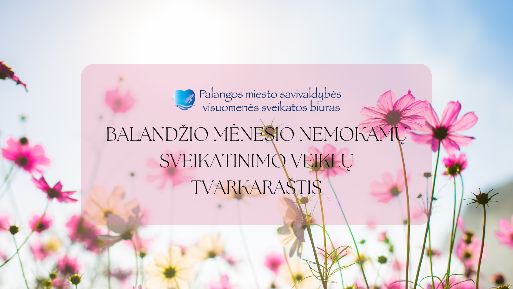 Kviečiame į Palangos miesto savivaldybės visuomenės sveikatos biuro organizuojamas nemokamas sveikatinimo veiklas balandžio mėnesį. Su tvarkaraščiu galite susipažinti ČIA.